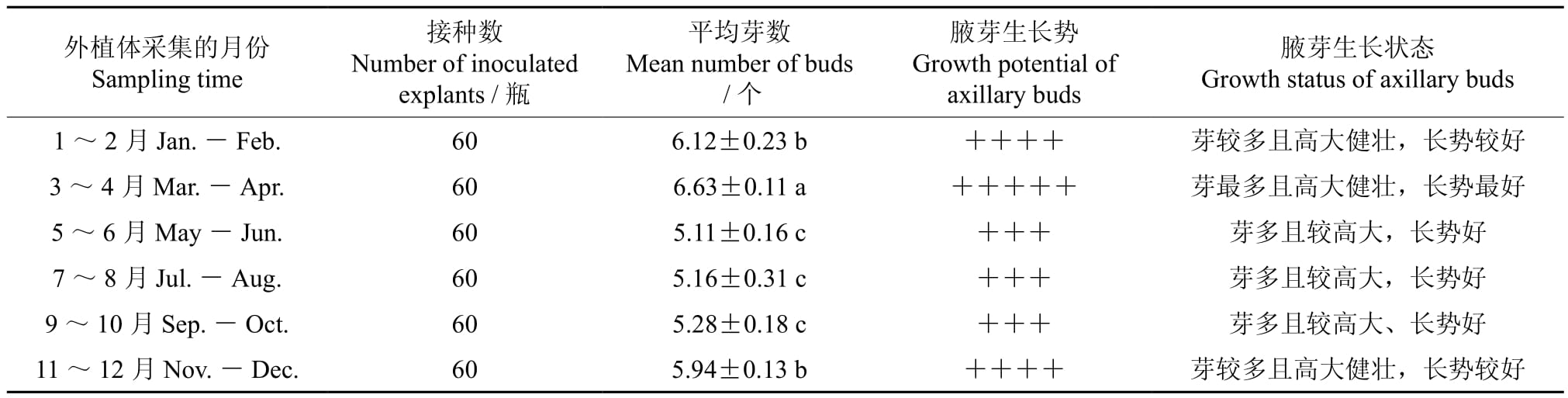 表1 外植體的不同采集時間對其腋芽萌發的影響†