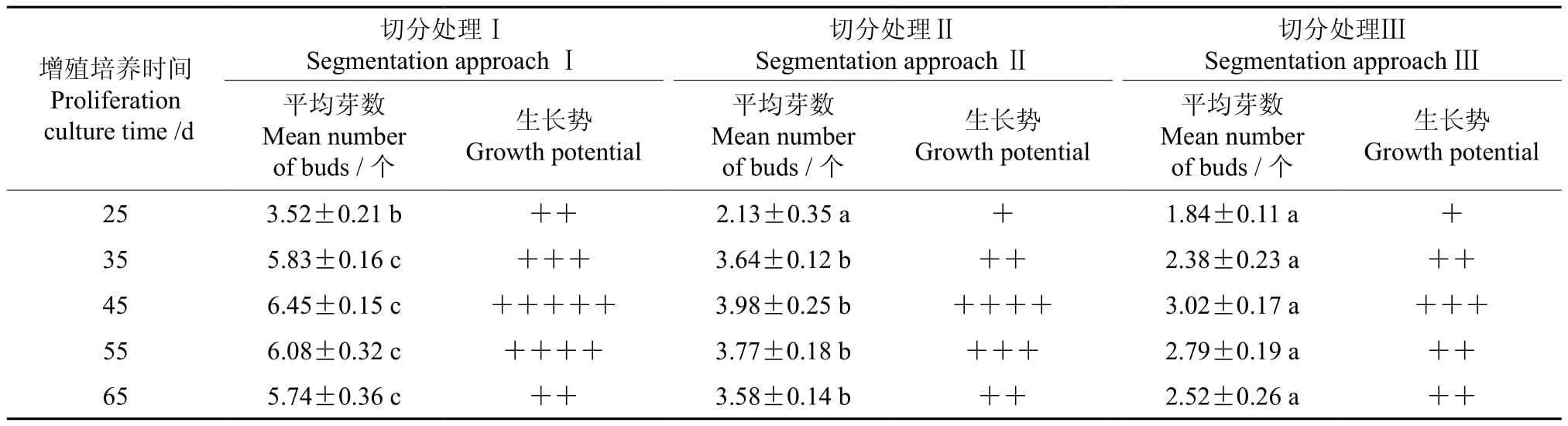 表2 增殖培養時間及切分處理方式對多花黃精根莖芽增殖的影響†