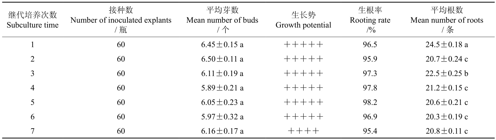 在連續進行的7次繼代培養中,繼代培養的不同次數對多花黃精增殖的影響沒有達到顯著差異水平,第1~7次繼代培養增殖的平均芽數分別為6.45、6.50、6.11、5.89、6.05、5.97和6.16 個,差值小於0.7(見表3)。觀察發現,隨著繼代培養次數的增加其增殖的平均芽數雖然沒有顯著的差異,前6次繼代培養的芽體均健壯高大,葉片均鮮嫩;但是,繼代培養到第7次以後,增殖過程中有輕微的玻璃化現象出現,繼續增加繼代培養的次數後,玻璃化現象愈發嚴重。因此,綜合考慮多花黃精工廠化育苗係統認為,在不嚴重危害苗木生產又能保證苗木數量的前提下,適宜的繼代培養次數應為7次。