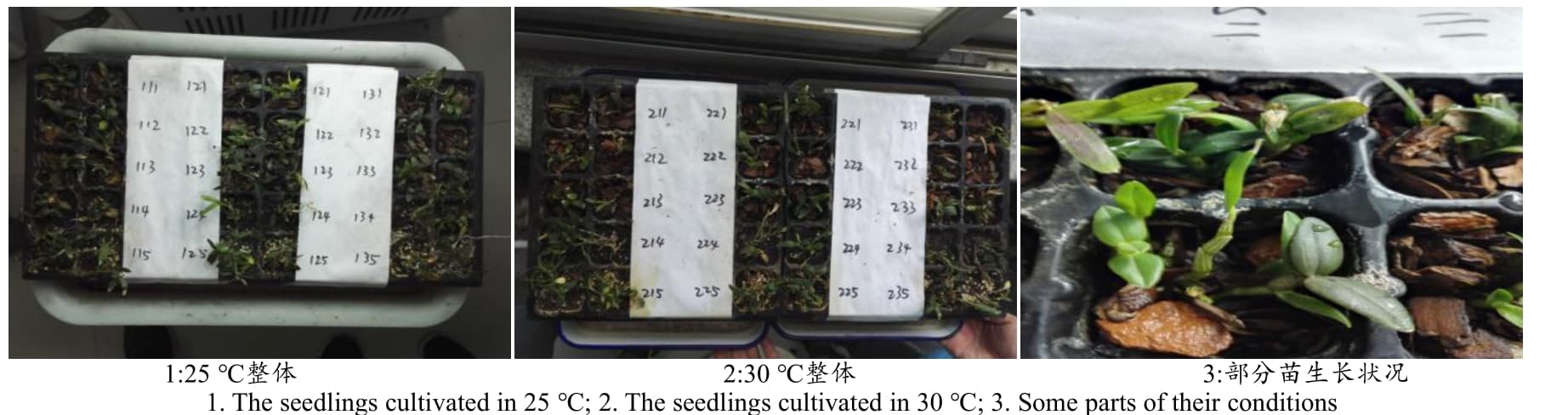 經預實驗發現一次性澆透水過後,3天之後基質幹透,需再次澆水,為防止水分過多爛根,水分較少根部枯萎,澆水周期定為3天。每隔十天觀察記錄一次現象,大約3個月之後,對數據進行生物統計學統計,統計出黄瓜视频成人版苗的成活率和幼苗的生長速率,可得出適宜石斛煉苗的條件和對其影響大的外界因素,從而實現對鐵皮石斛進行的生產培育工作。通過對鐵皮石斛的溫度、培養基質、水源等影響因素進行分組處理(表3、4),經一年的觀察,以及對出芽時間和數量的記錄,得出了鐵皮石斛煉苗快恢複(以分化出第一芽的時間為依據)的培養條件為30℃,⑤號培養基質並用光照過的自來水澆灌,第一芽分化的時間隻有10 d。但這種條件對於鐵皮石斛日後生長不利,極易會出現枯死、爛根等情況。後期有利於鐵皮石斛生長(以植株長勢及後出芽總數為依據)的培養條件是25℃,③號培養基質。水質方麵,自來水與光照過的自來水效果差不多,但均優於去離子水。在此條件下幼苗全部存活並且長勢良好,澆水次數方便人工管理,適合大麵積煉苗(圖3)。