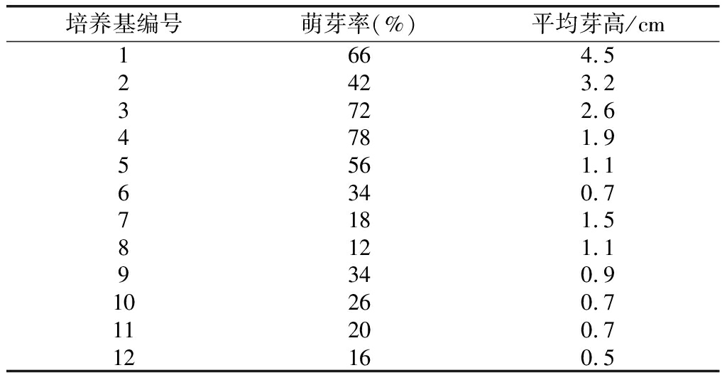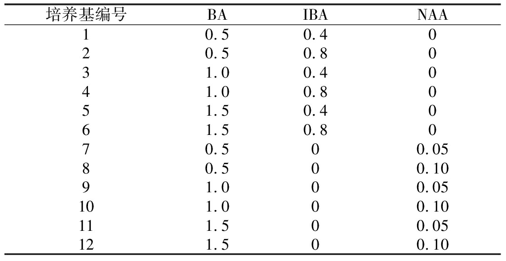 以MS為基本培養基,添加不同質量濃度的激素(BA、IBA及NAA)配製12個配方的誘導培養基(表1)。在無菌環境中將消毒後的外植體切取腋芽,接種於誘導培養基上,每個配方接種50瓶,每瓶1個外植體,20d後統計其萌芽率,40d後統計腋芽生長高度。