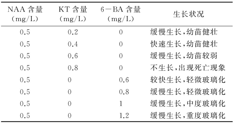 1.2.4 繼代培養基的選擇 當誘導的叢生芽長到約1 cm時,在超淨工作台中將叢生芽分切為單苗,接種於繼代培養基中進行繼代培養(表2),根據不同培養基中幼苗生長情況,篩選佳繼代培養基。