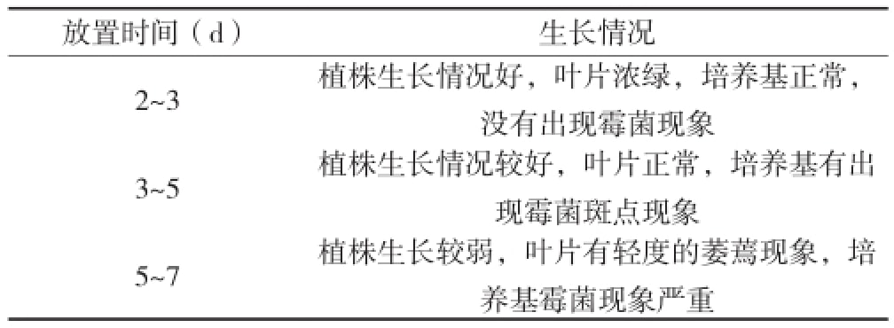 (2)開瓶:出瓶前先將瓶蓋打開,讓瓶苗在室外空氣中放置分別放置2~3、3~5、5~7 d,讓其適應自然溫濕度。