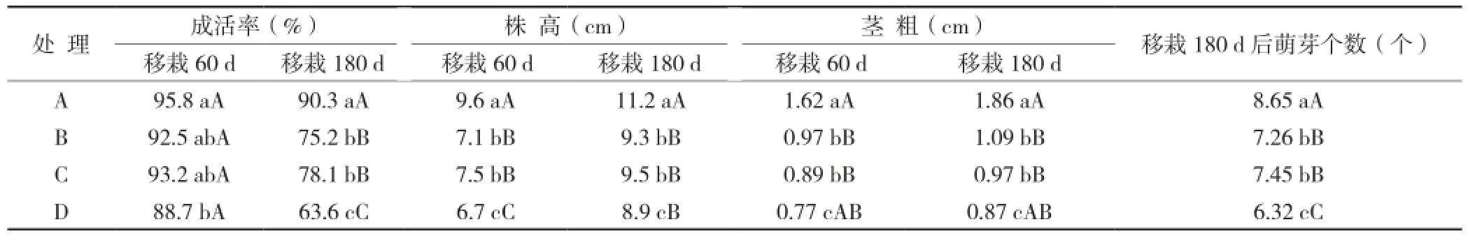 (4)基質配比:試驗選用鋸木、泥炭、蛭石、珍珠岩進行基質優化篩選,基質配比配方如下:A,鋸木∶泥炭∶蛭石=1∶2∶1;B,鋸木∶泥炭∶蛭石=1∶1∶1;C,鋸木∶泥炭∶珍珠岩=1∶2∶1;D,鋸木∶泥炭∶珍珠岩=1∶1∶1。鋸木通過堆漚發酵處理,基質在使用前經高溫消毒,用營養盤進行栽培,每種基質栽50株,分別於60和180 d後對植株株高、莖粗、萌芽數、成活率等指標進行觀察。