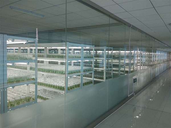 將初代培養長出的莖剪成1.5-2厘米長莖段轉接到增殖培養基中。30-35天增殖5-7倍,增殖苗生長健壯。