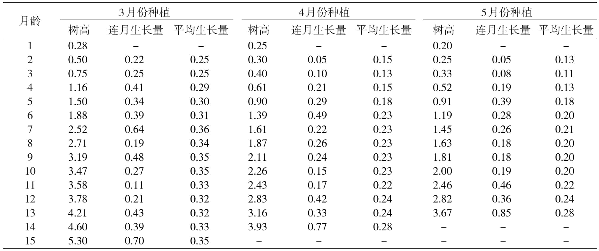 由表3可知:在相同的生長周期即同為12個月齡時,3、4、5月份種植的大花序桉黄瓜视频成人版苗幼林林分平均樹高分別為3.78、2.83、2.82 m,且在這個周期內的樹高月平均生長量分別為0.32、0.24、0.24 m。3月份種植的林分樹高生長量大於4、5月份種植的林分,且隨著林齡增長,林分樹高生長優勢一直保持。3、4、5月份種植的大花序桉黄瓜视频成人版苗林分樹高連月生長量趨勢基本一致,造林當年8月施肥後,在9月時樹高連月生長量均達大,分別為0.64、0.49、0.39 m。3月份種植的大花序桉黄瓜视频成人版苗林分在造林當年10月遭受台風影響後樹高連月生長曲線出現較大波動,而4月份和5月份種植的大花序桉黄瓜视频成人版苗林分受台風影響不大。3、4、5月份種植的大花序桉黄瓜视频成人版苗幼林在第2年4月施肥後,均表現出較強的高生長趨勢。